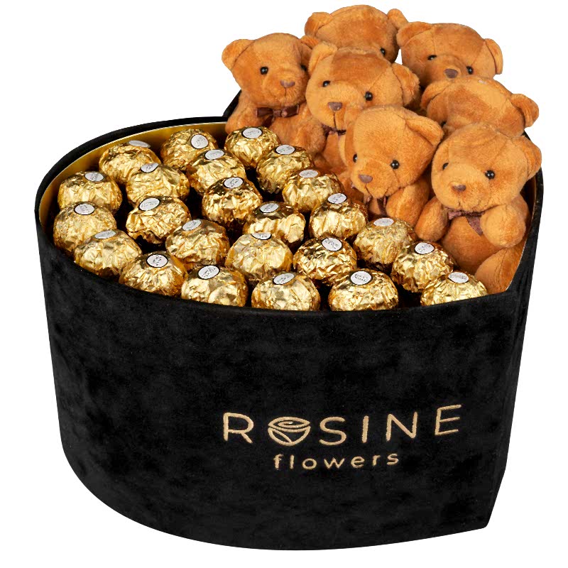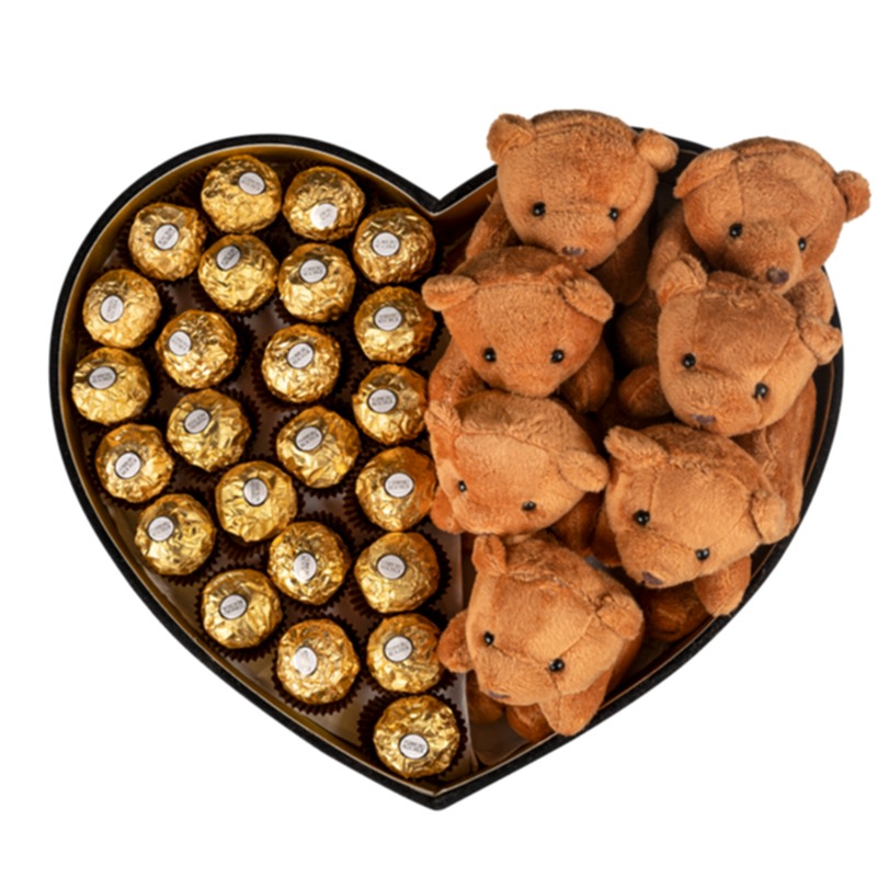 Siyah kadife kalp kutu içerisinde 7 aded mini ayıcık ve 23 adet Ferrero Rocher çikolata