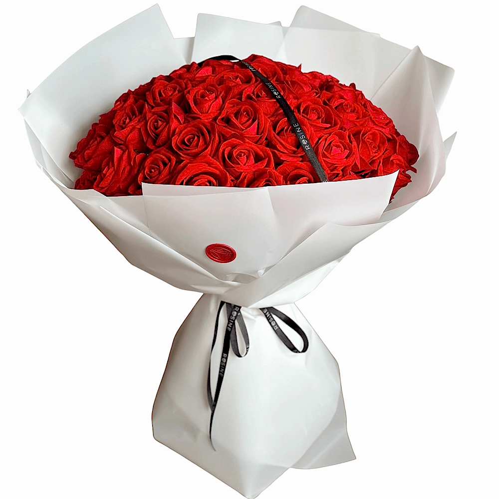 Bu muhteşem yapay kadife kırmızı gülden oluşan tarz buket, isteme ve nişan gibi özel anlarınızın yanı sıra hiç bir sebep yokken sevdiklerinize aşkınızı göstermeniz için zarif bir dokunuş katmak için tasarlandı. Kırmızı güller, aşkın ve tutkunun sembolü olarak bilinirken, yapay kadife dokusu bu buketi gerçekçi ve etkileyici kılıyor.