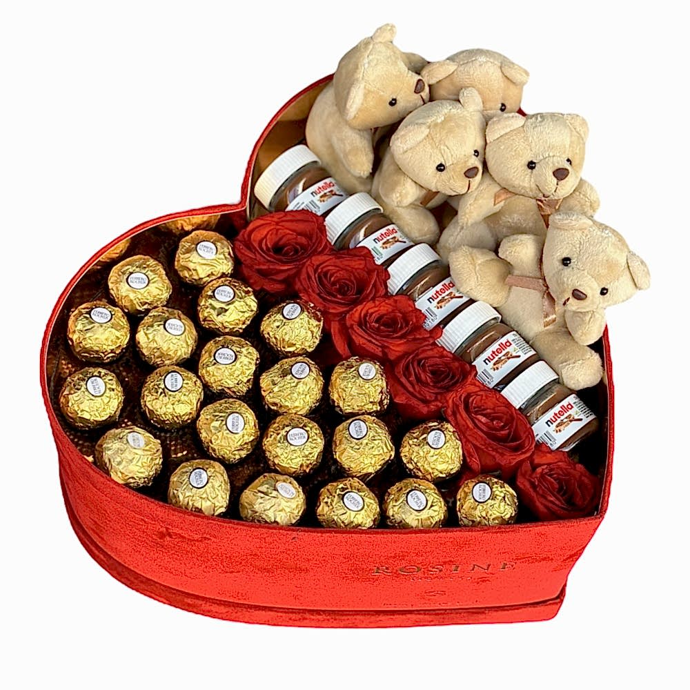 Hem çikolata hem çiçek severler için “Pretty in red” muhteşem seçimdir. Kırmızı ithal güller, nefis ferrero rocher, kadınların sevimlisi mini nutella ve ayıcıkların muhteşem uyumu sevdiklerinizin gününü güzelleştirmek için yeterlidir. Üst kalite kadife kalp kutu içerisinde 5-6 adet kırmızı gül, 5 adet nutella, 5 adet ayıcık ve Ferrero rocher bulunuyor. Ürünün gönderimi yalnız İstanbuladır.